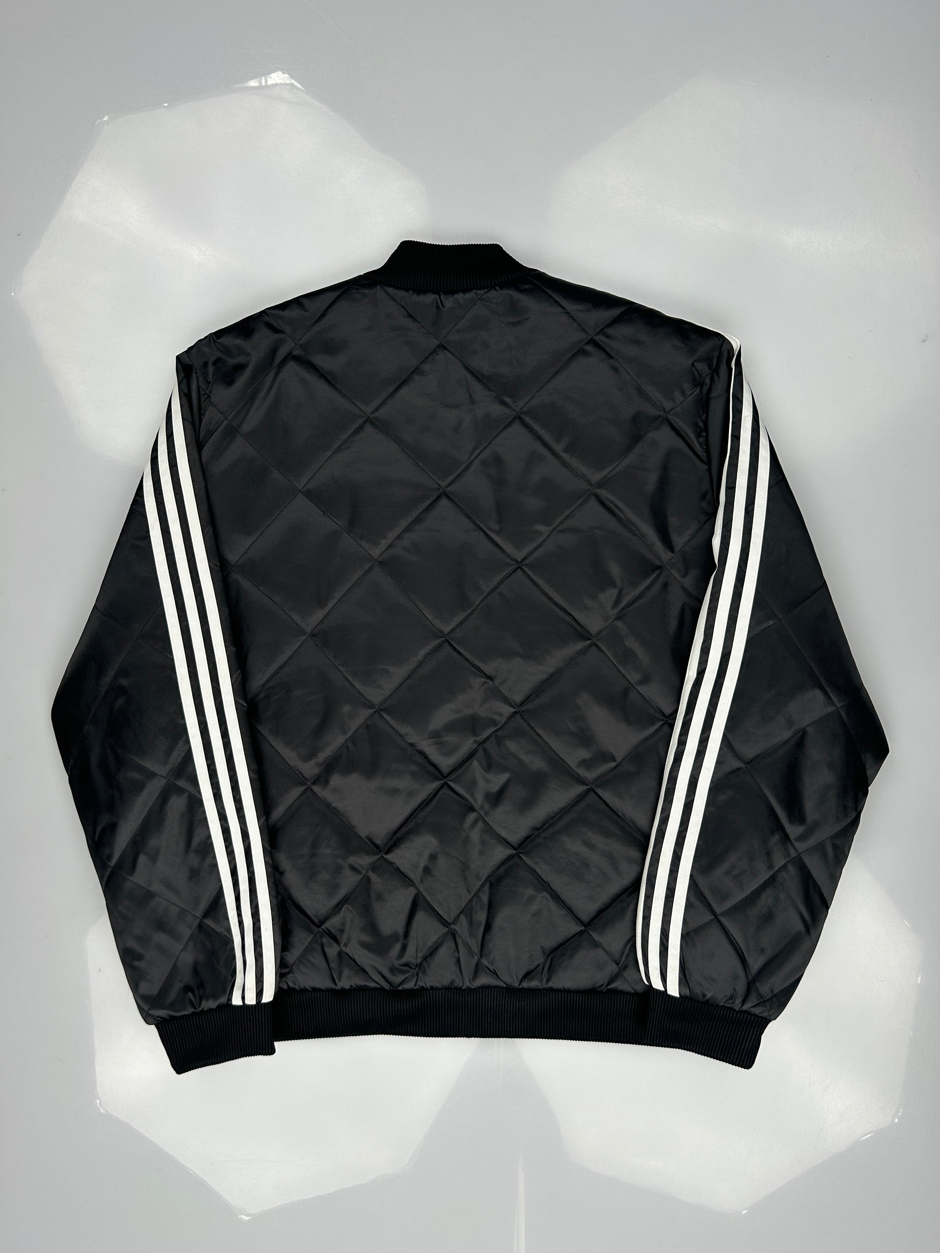 This is an Adidas Originals SST Quilted Jacket in black polyester satin with a water-repellent finish