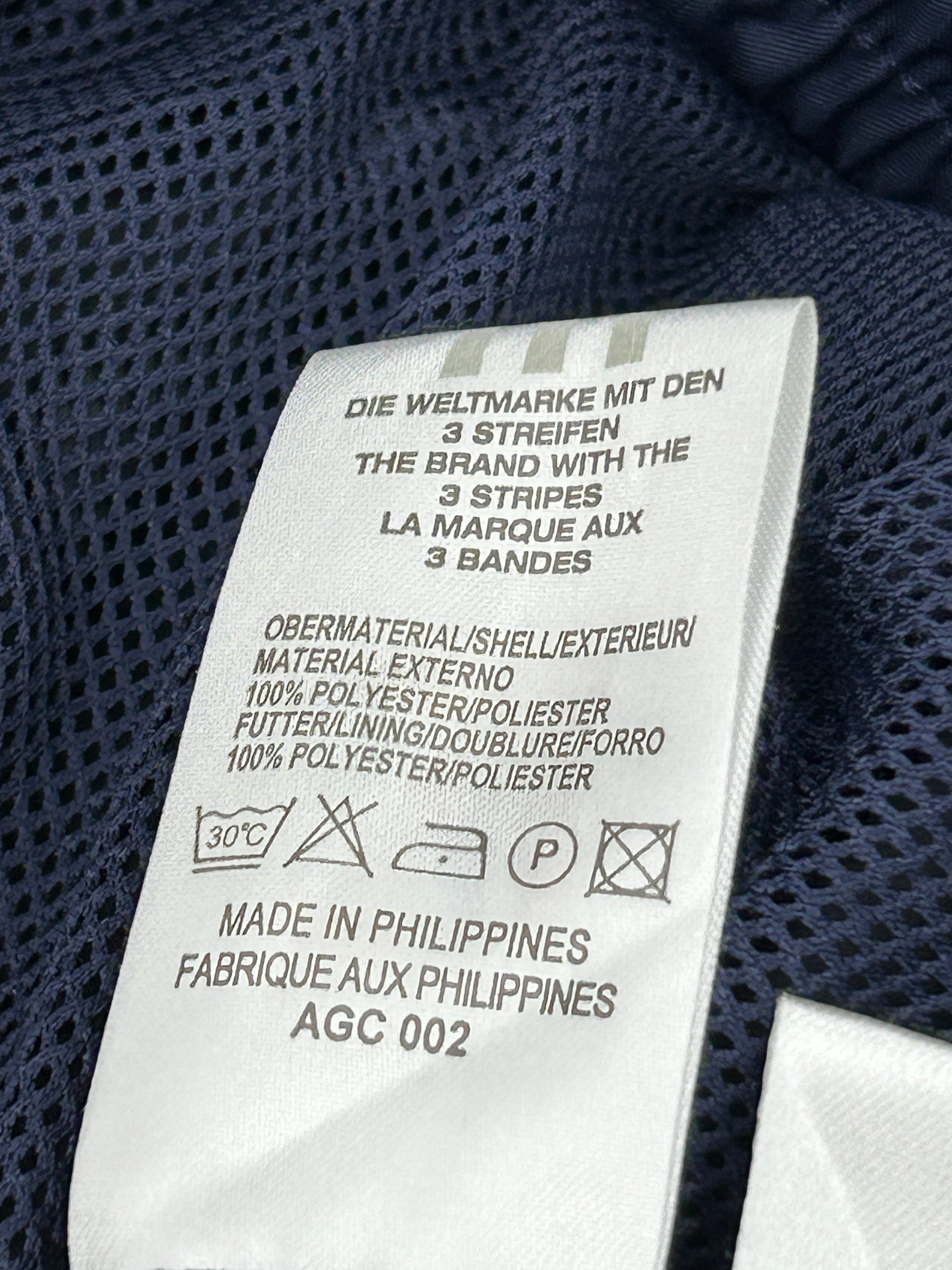 This is a vintage Adidas windbreaker jacket in navy blue and red with white accents.