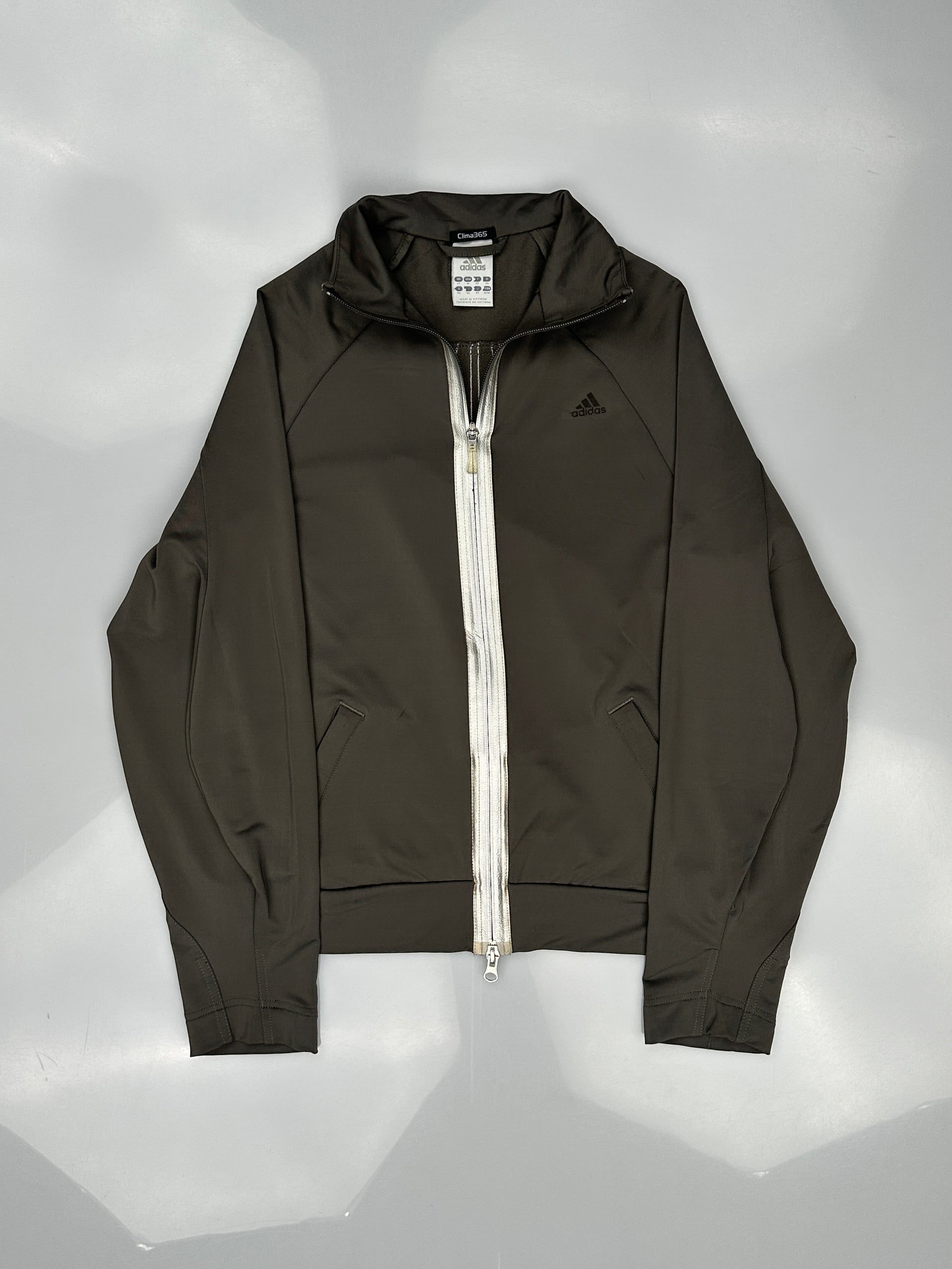 This is an Adidas zip-up track jacket in a brown color.