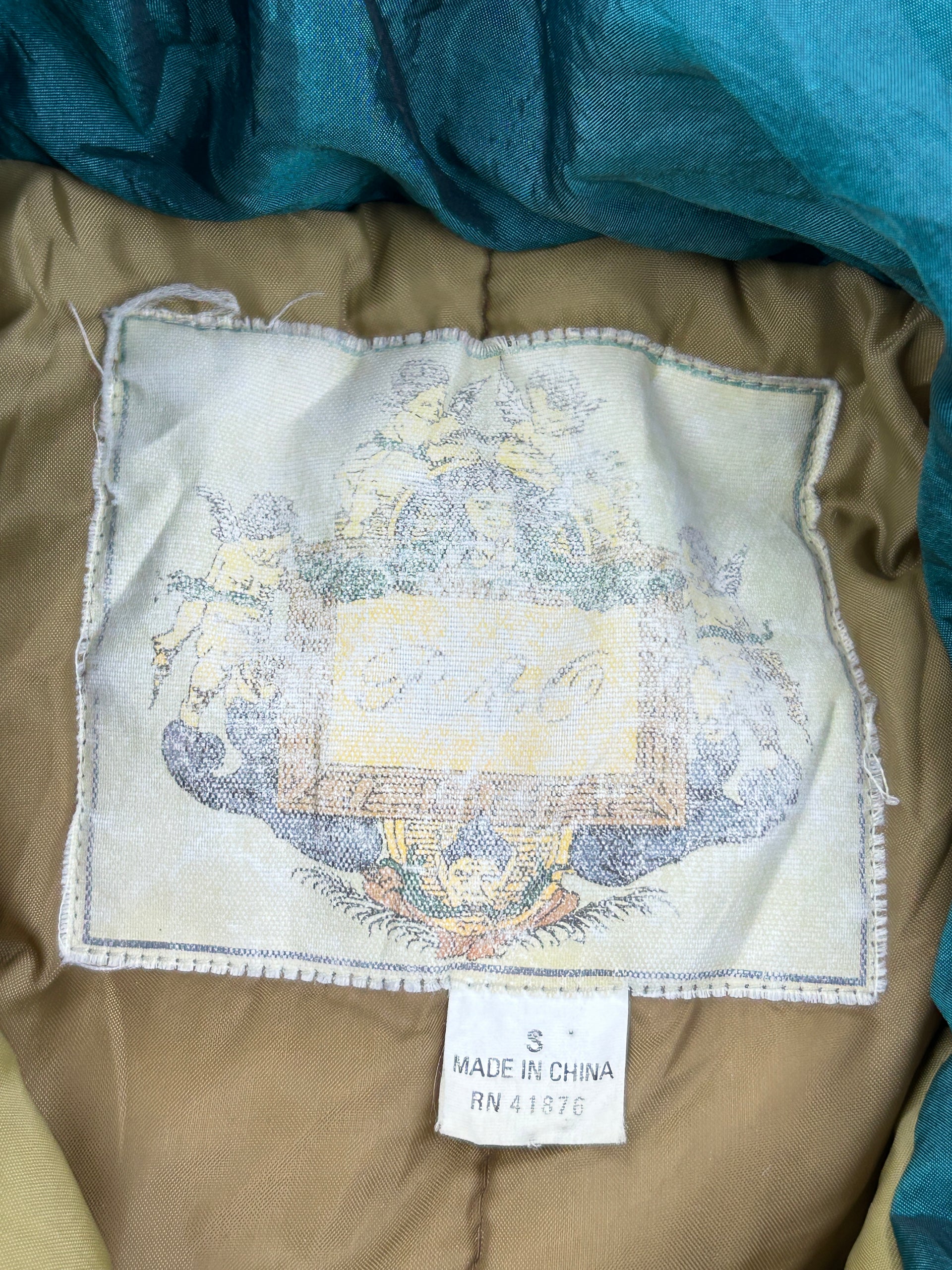 This is a vintage Andy Johns women's small ski jacket with a teal body, purple accents, and gold embroidery.