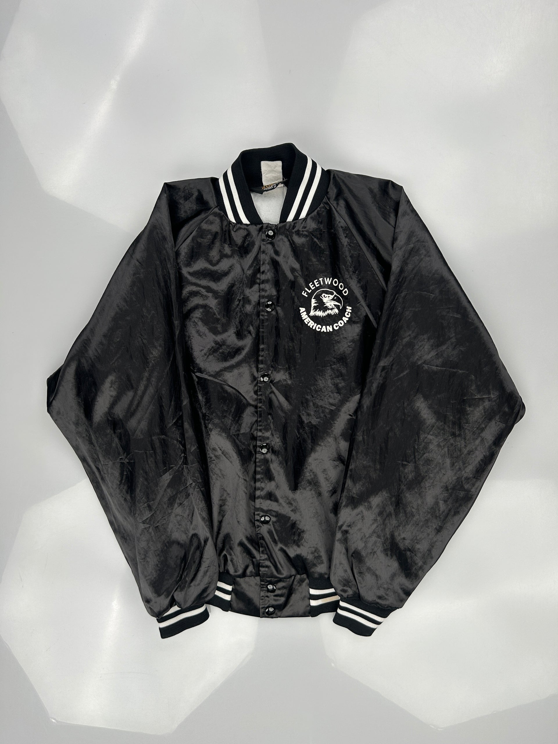 This is a vintage black nylon satin bomber jacket featuring a "Fleetwood American Coach" logo on the chest.