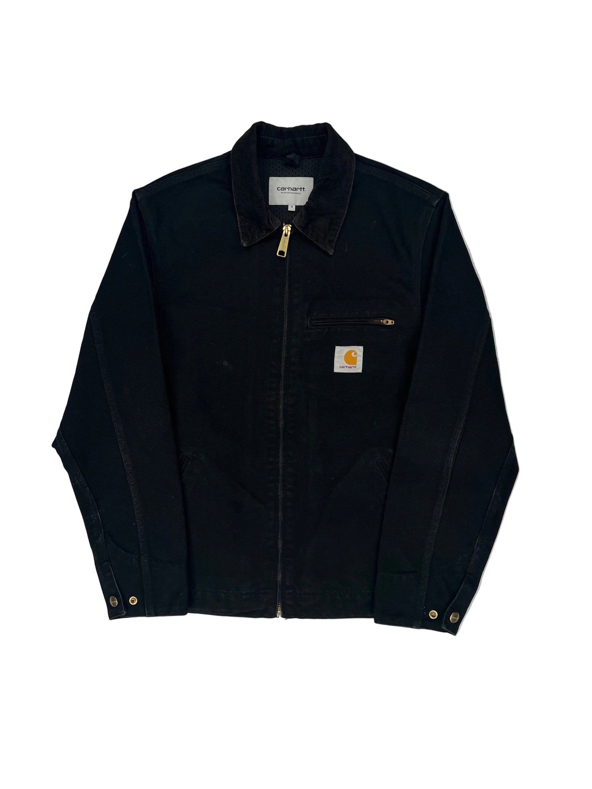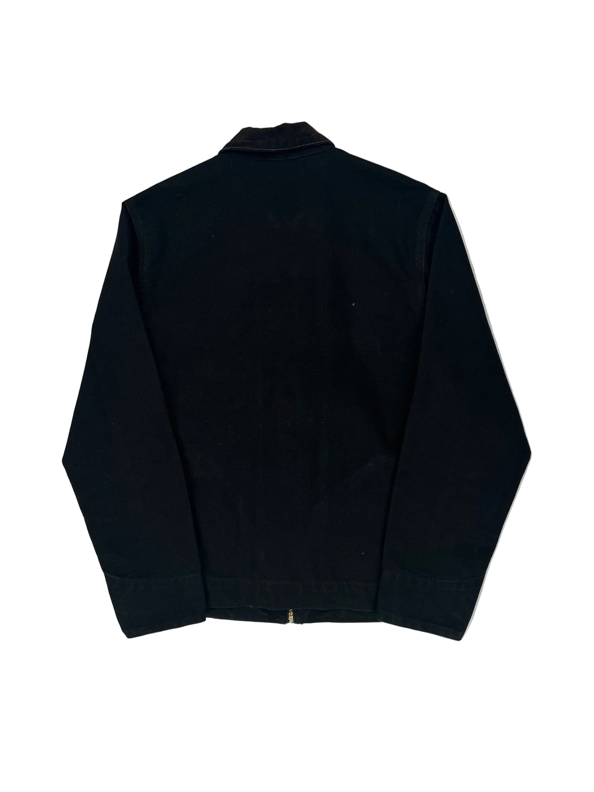 This is a black Carhartt WIP Detroit Jacket made from Dearborn organic cotton canvas with a corduroy collar and a woven square label.
