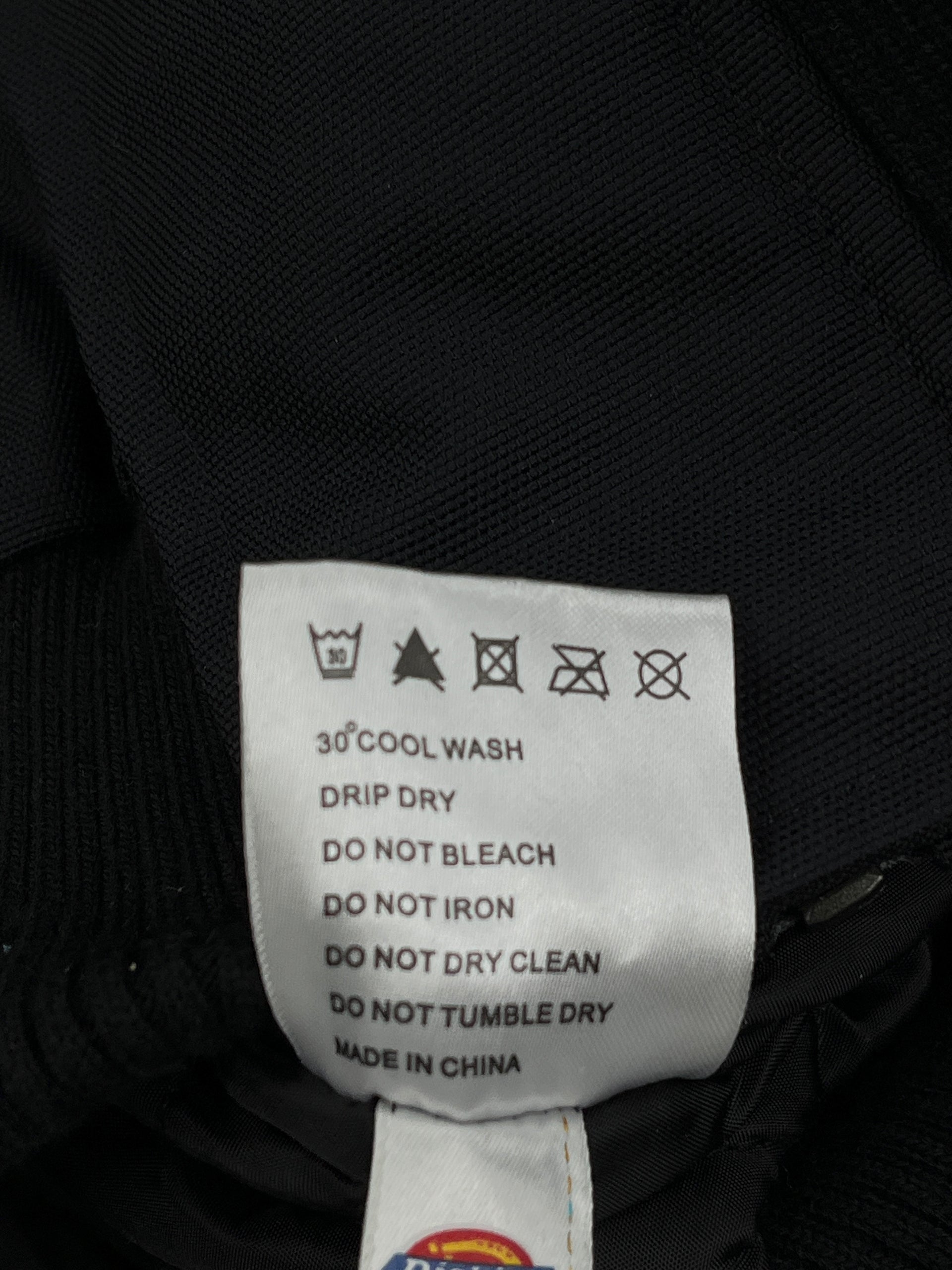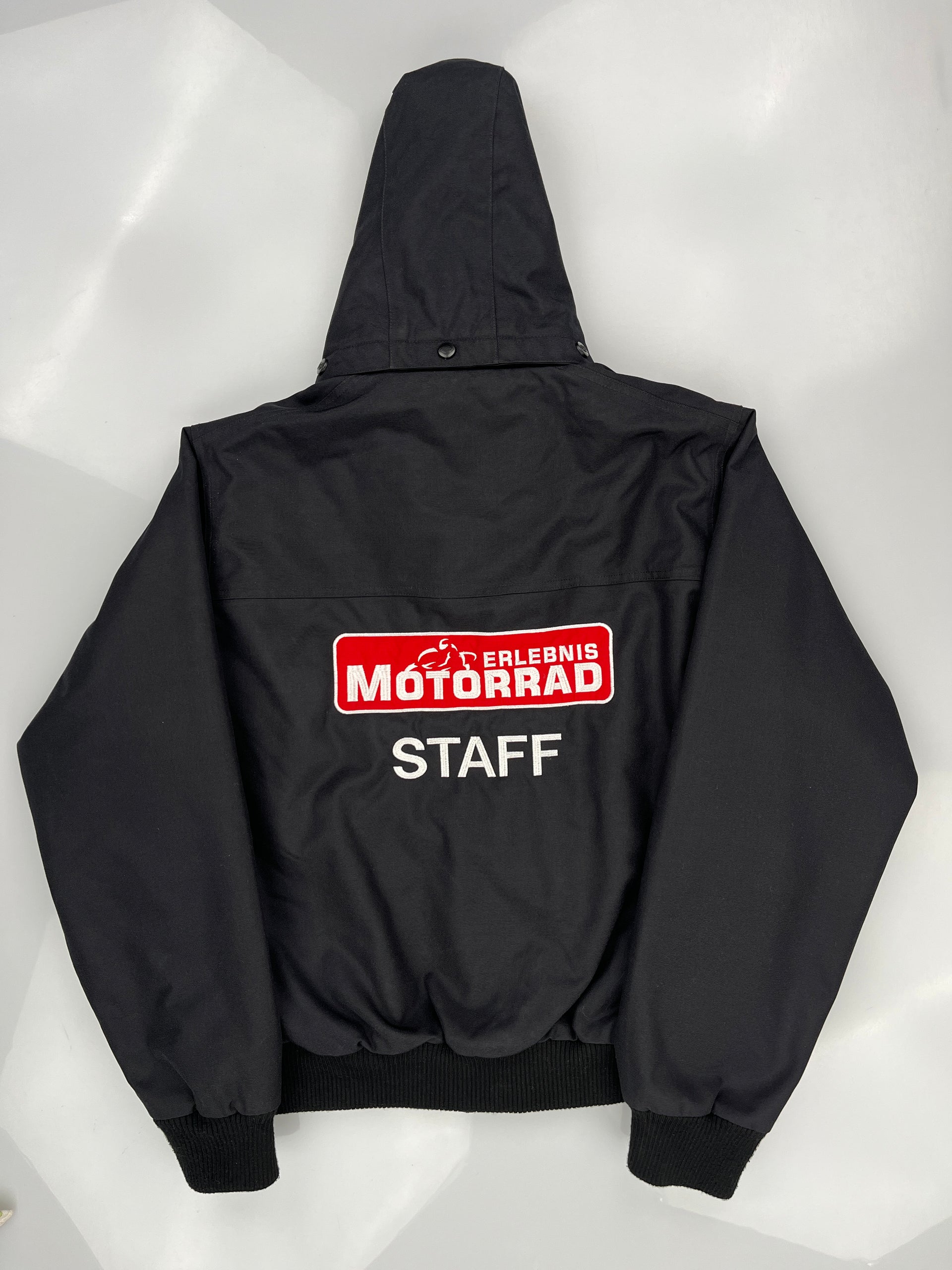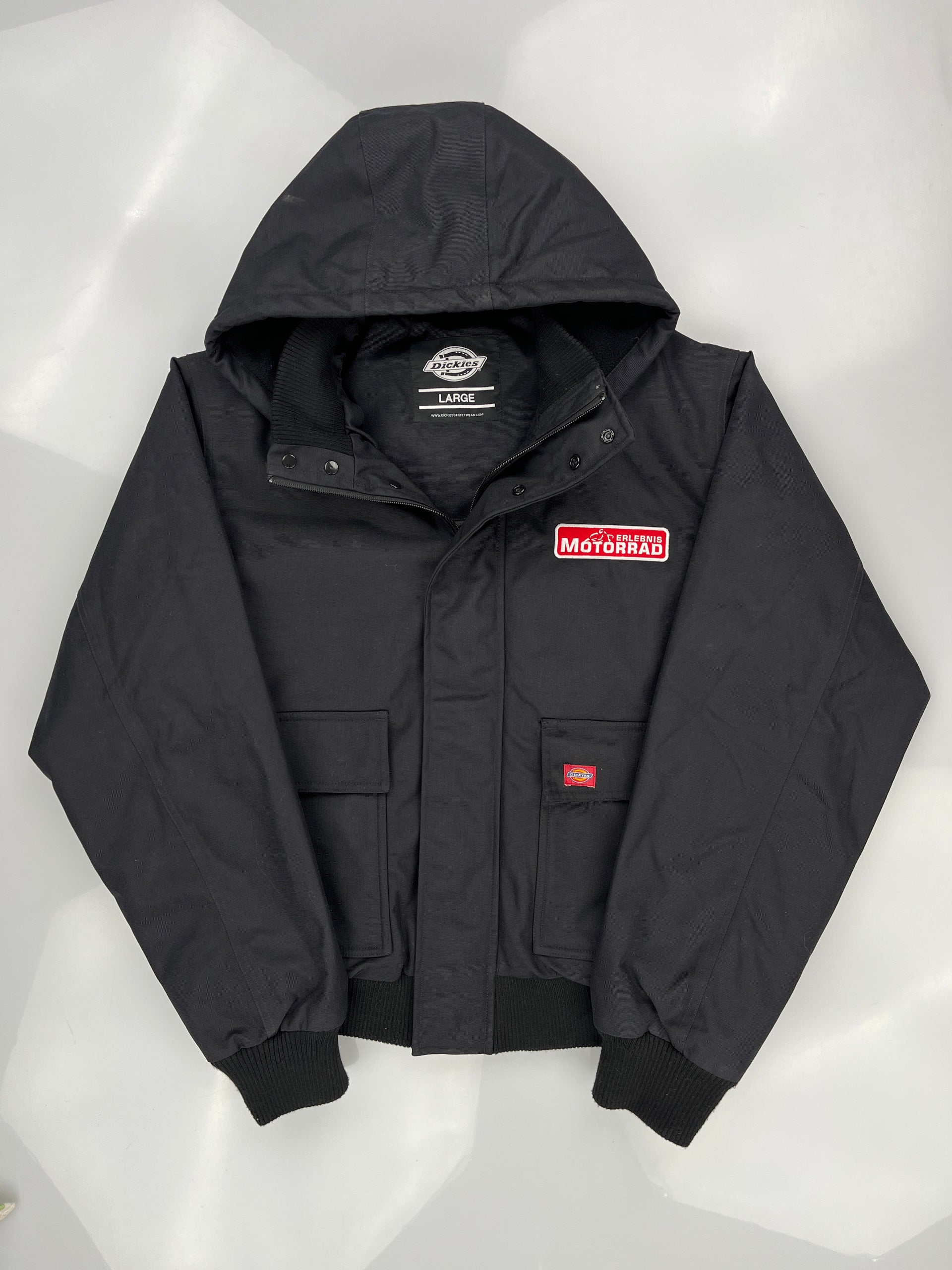 This is a black Dickies "Erlebnis Motorrad" staff jacket with a hood.