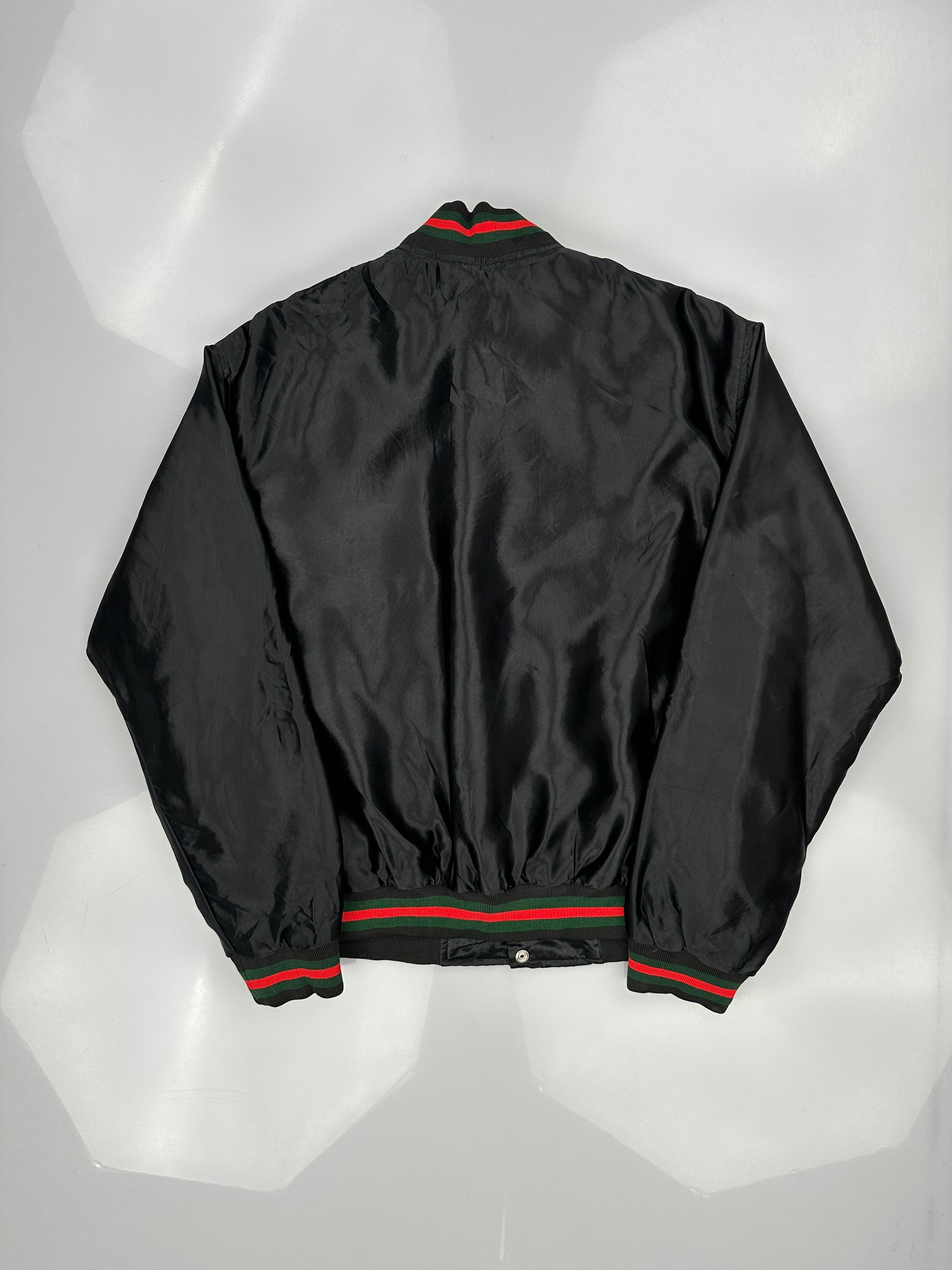 This is a black Fully Laced nylon bomber jacket.