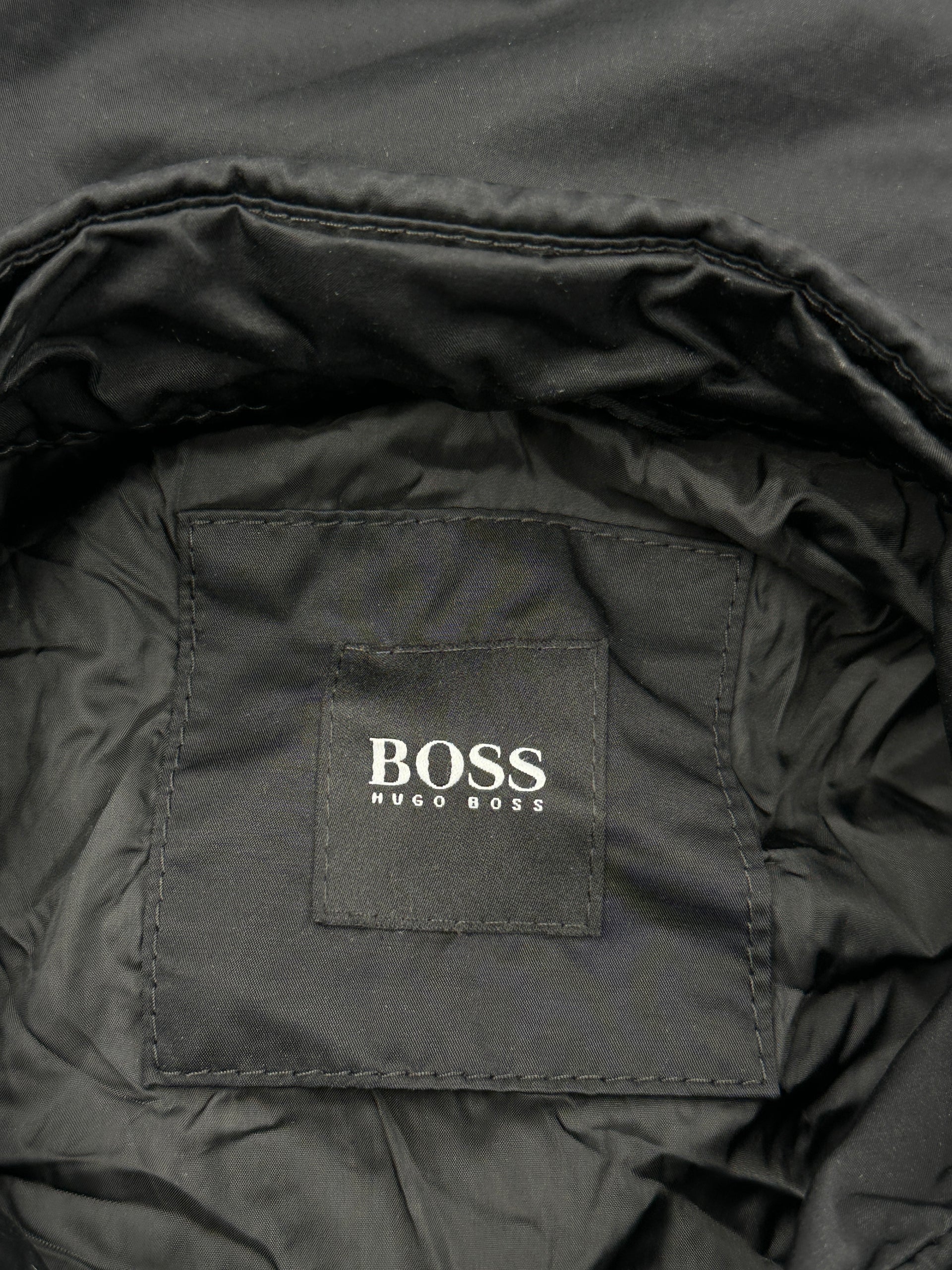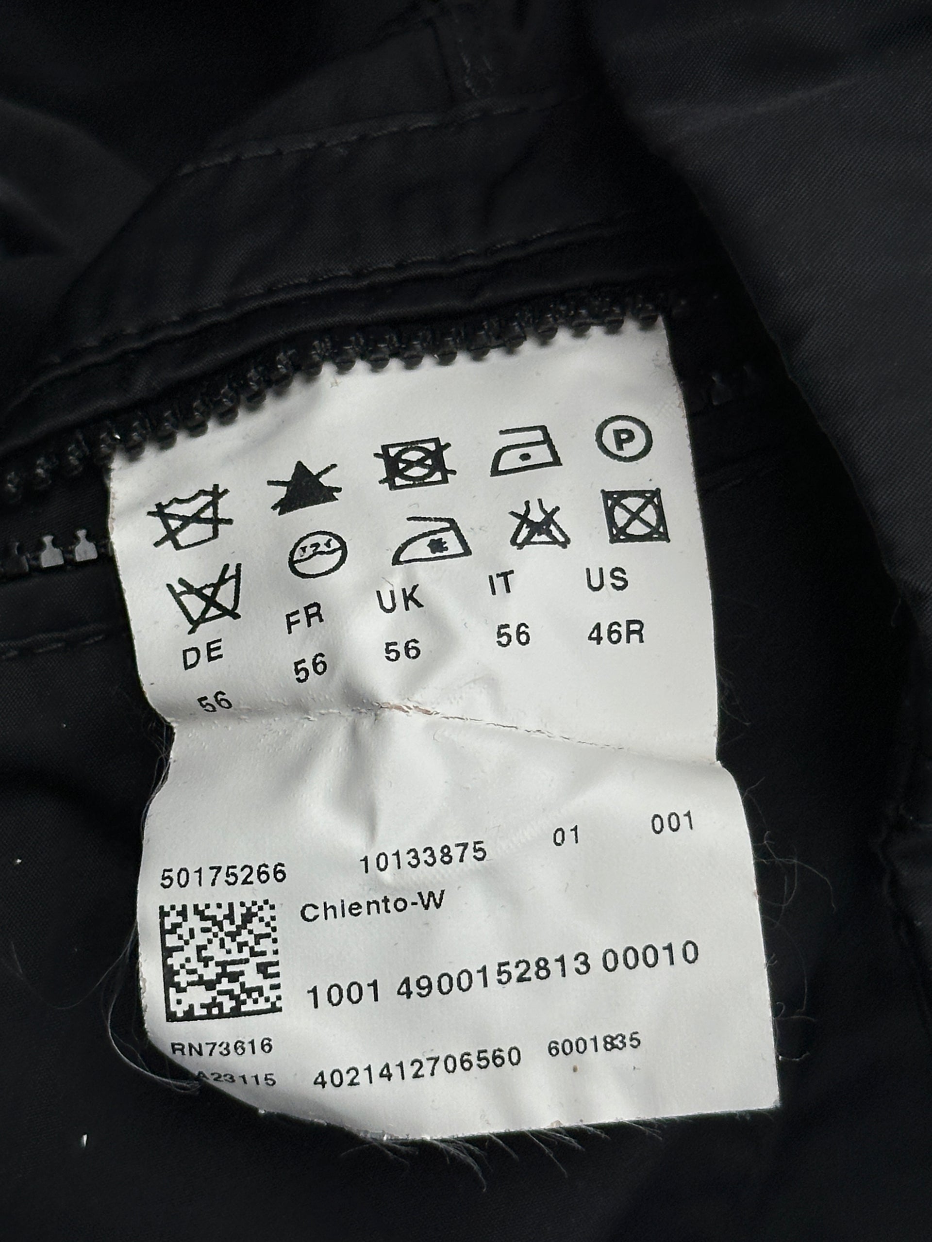 This is a black military-style field jacket with four large front pockets and shoulder epaulets.