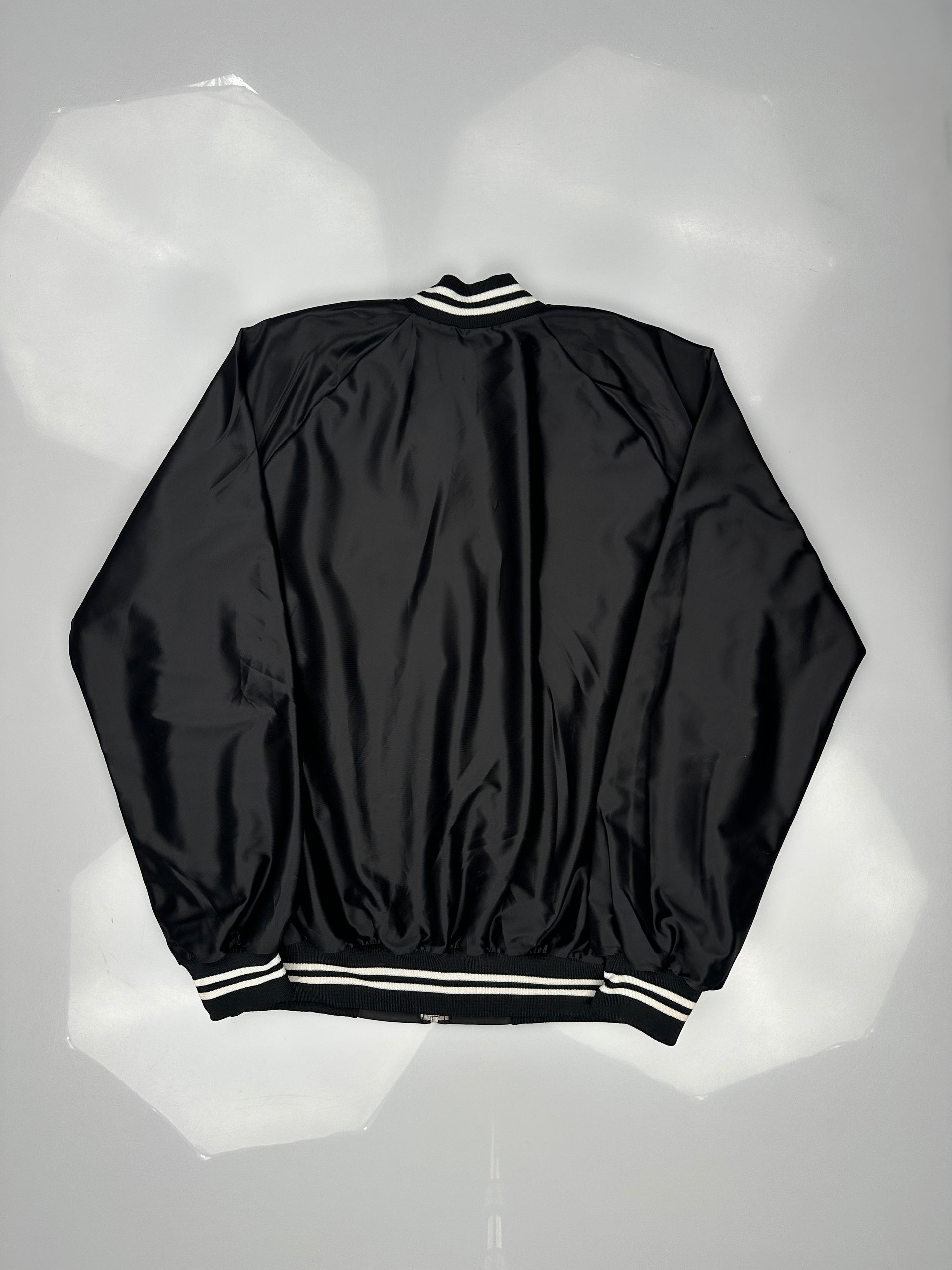 This is a black satin varsity jacket with white stripes on the collar and cuffs, featuring a shield logo with "OLD TIN SHED MEMBER" text stitched on the left chest.