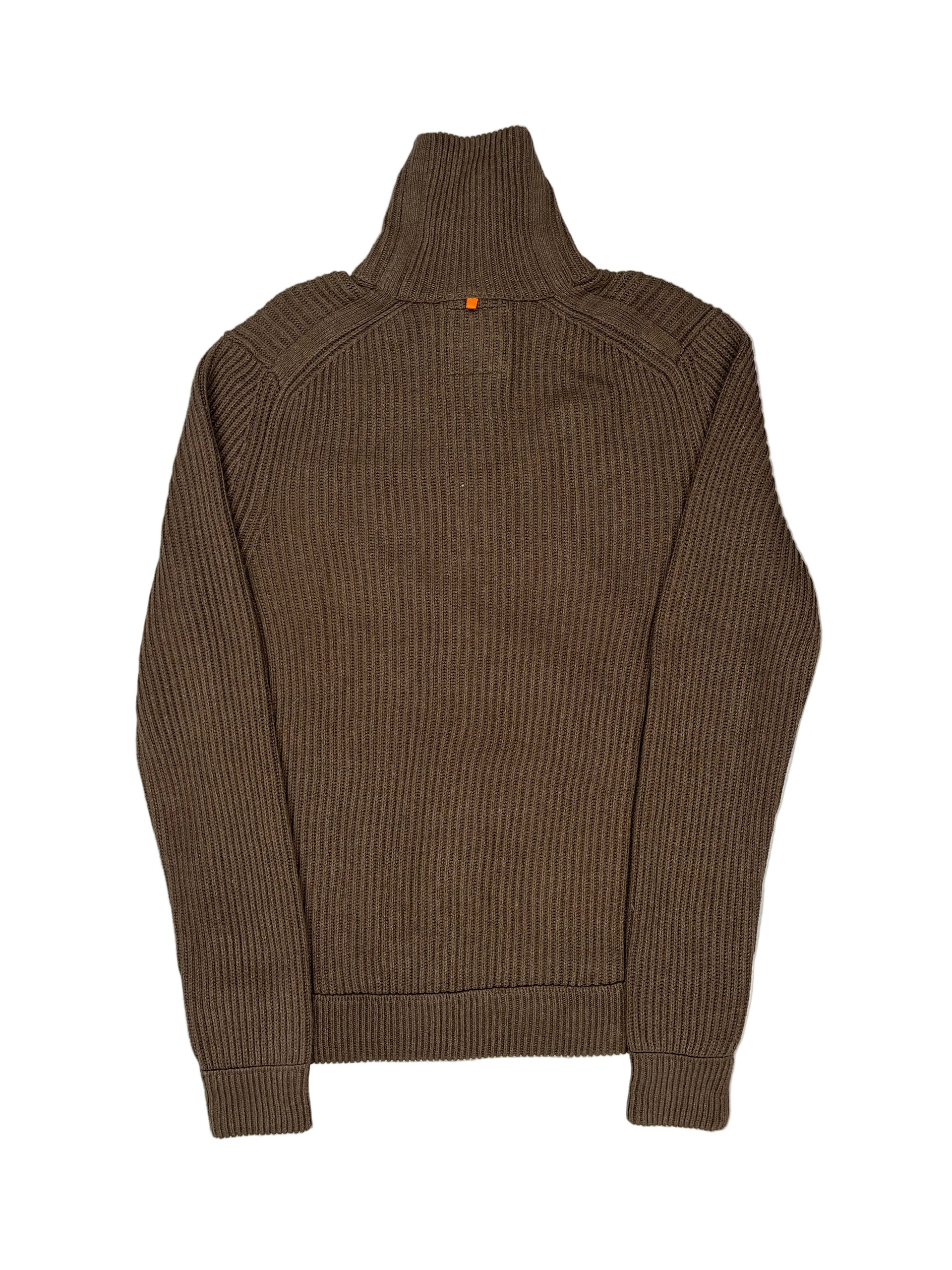 This is a brown Hugo Boss zip-neck sweater.