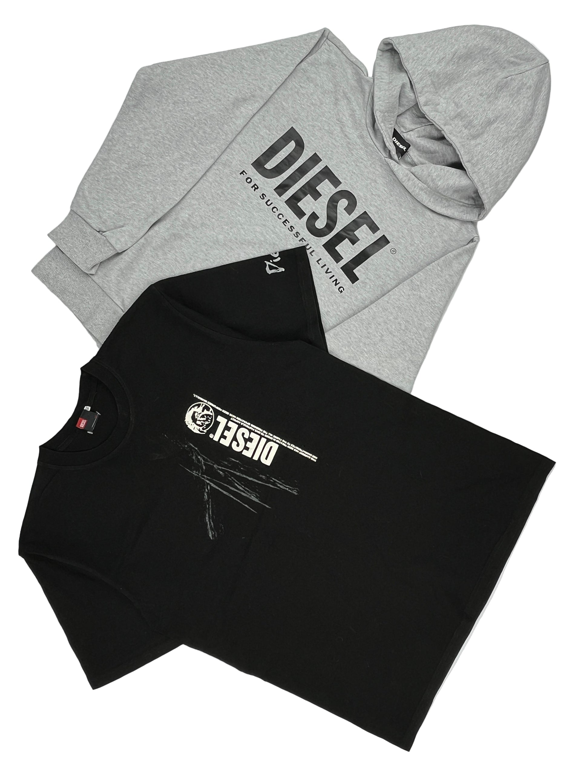 A selection of Diesel apparel, including jeans, sweatshirts, shirts, and T-shirts. These second-hand items are great for resellers in the premium casual wear market.