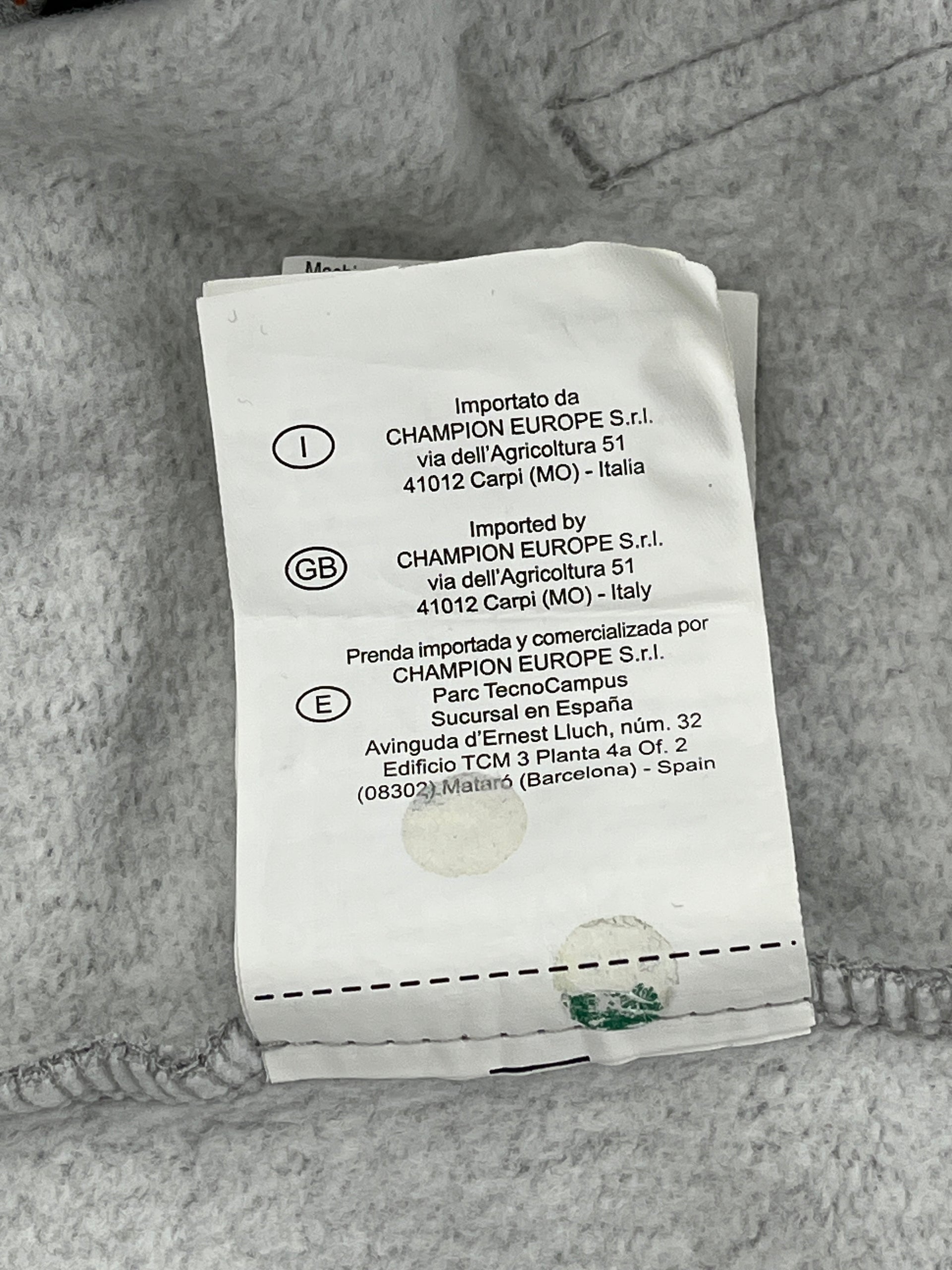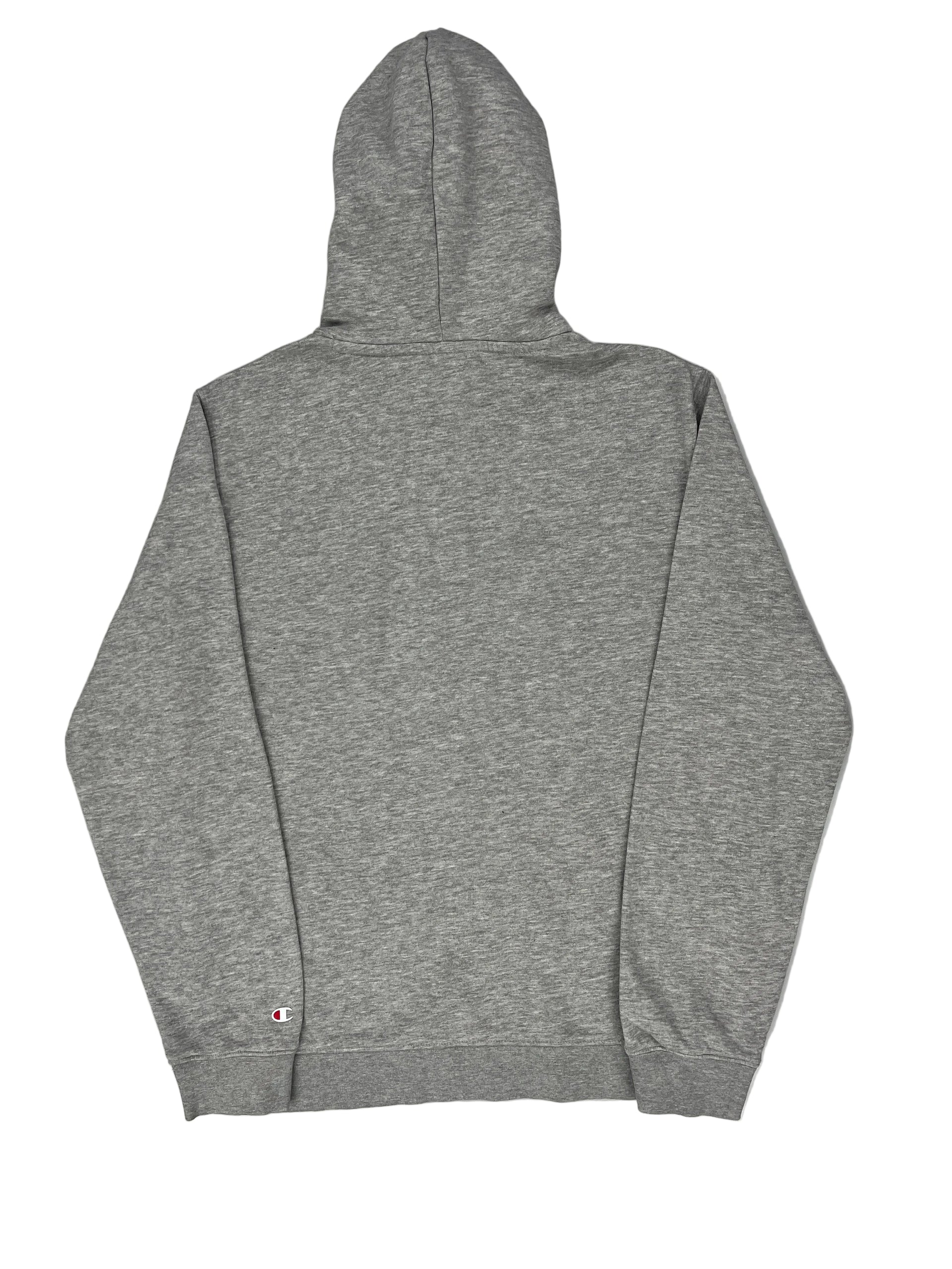This is a grey Champion hooded sweatshirt with a script logo on the chest and a kangaroo pocket.
