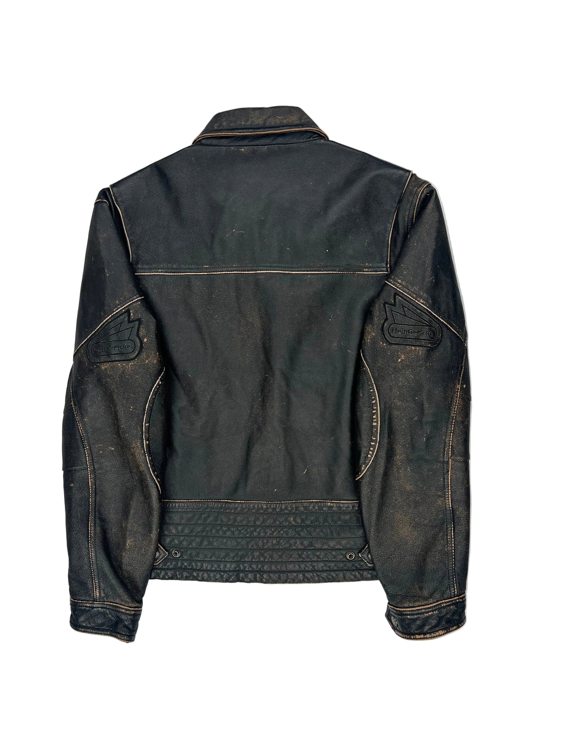 This is a distressed black leather moto jacket, From the brand Heingericke biker style.