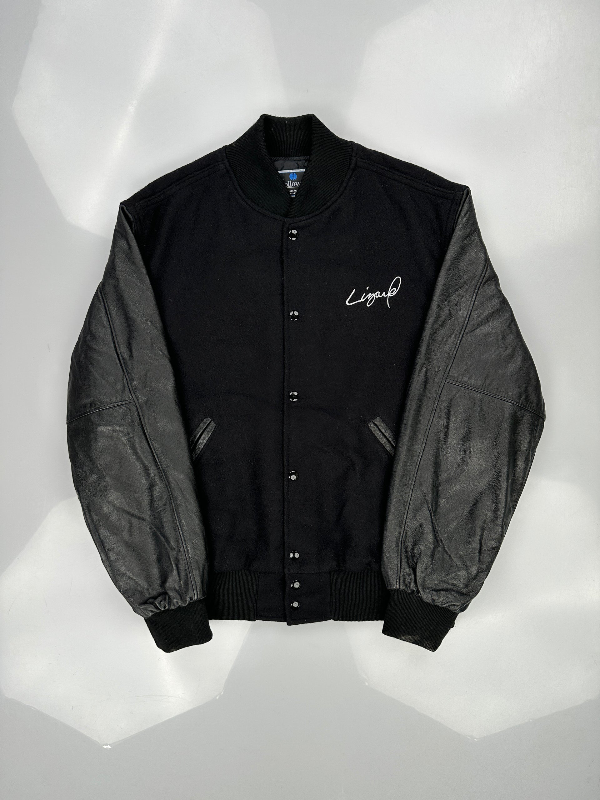 This is a Holloway black varsity bomber jacket with leather sleeves