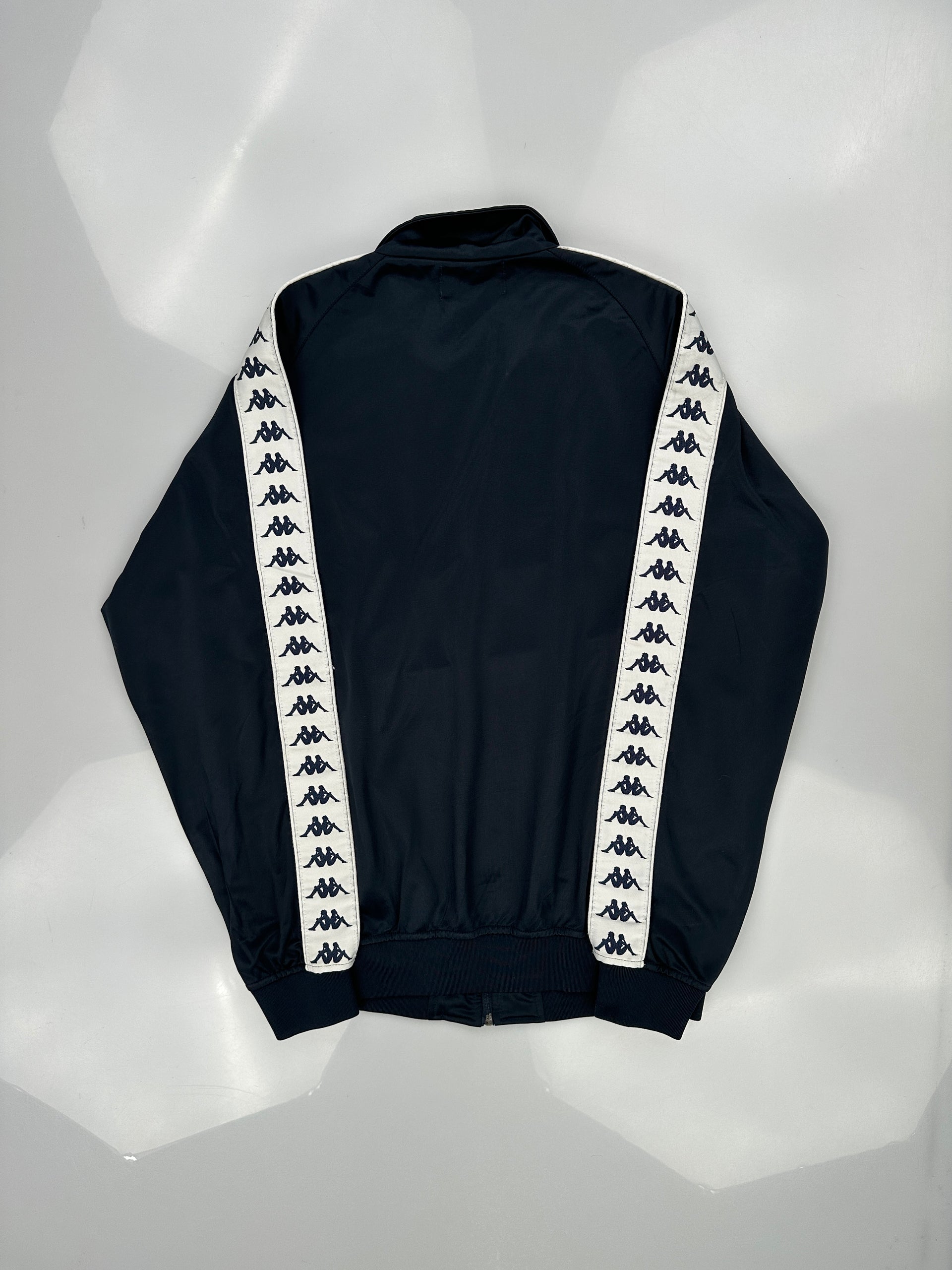 This is a Kappa Anniston slim fit track jacket in navy blue with white Omini logo tape down the sleeves