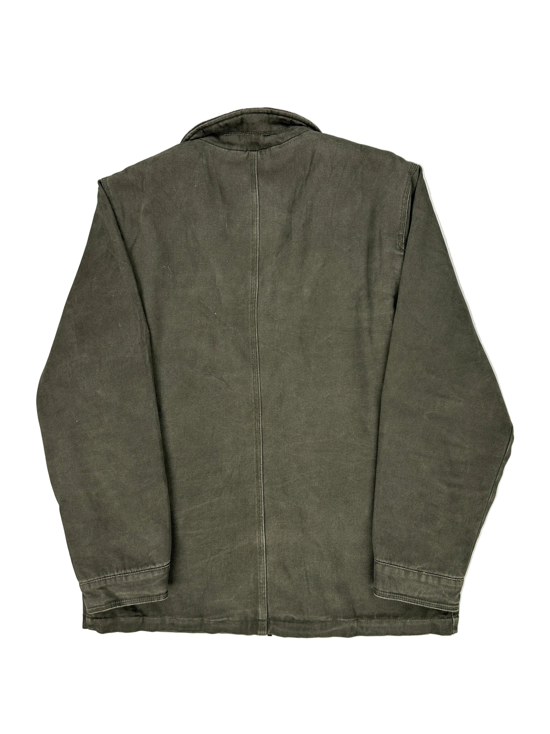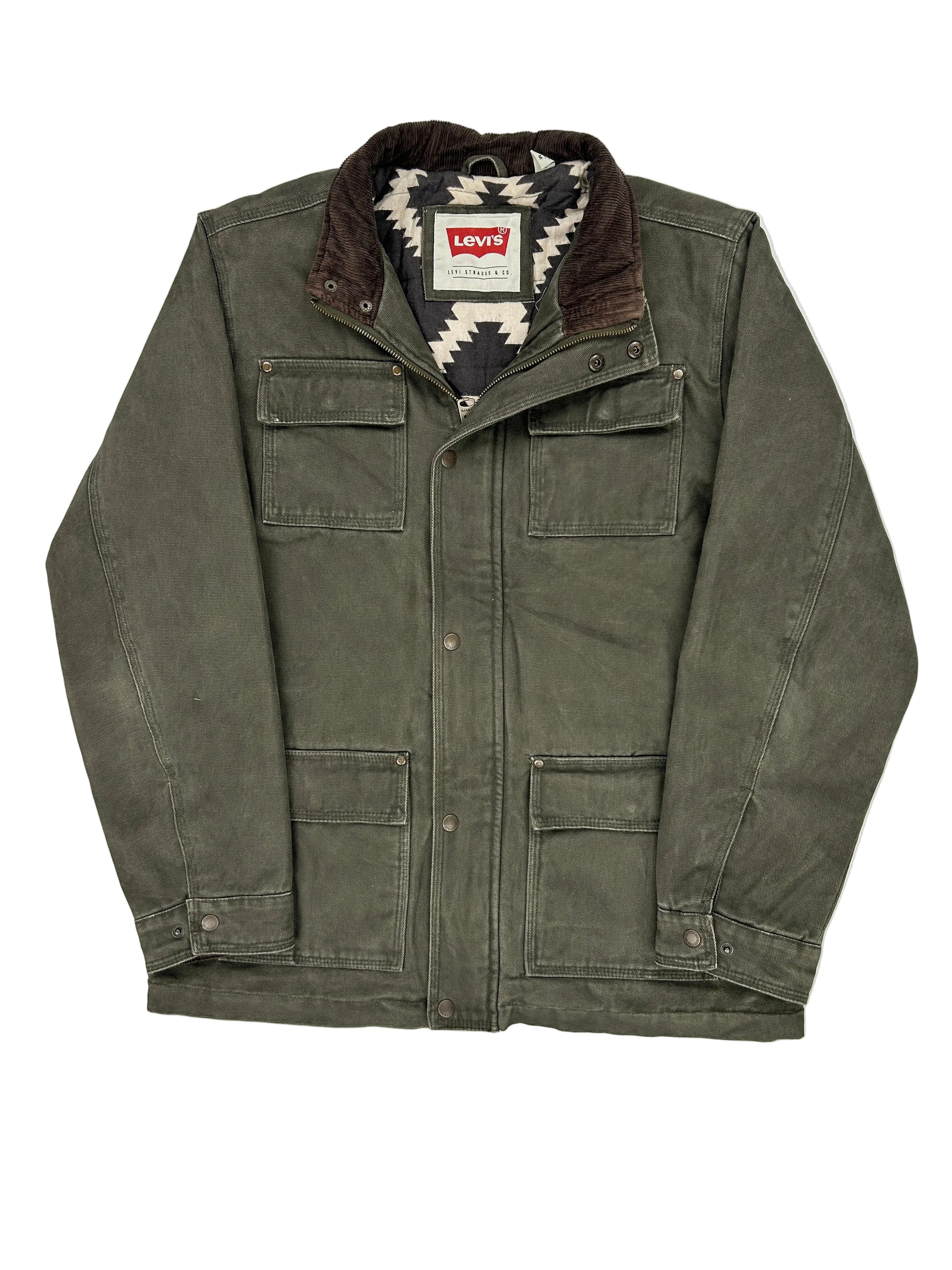 This is a Levi's utility jacket in dark olive green canvas with a brown corduroy collar and a black and white Aztec-patterned lining.