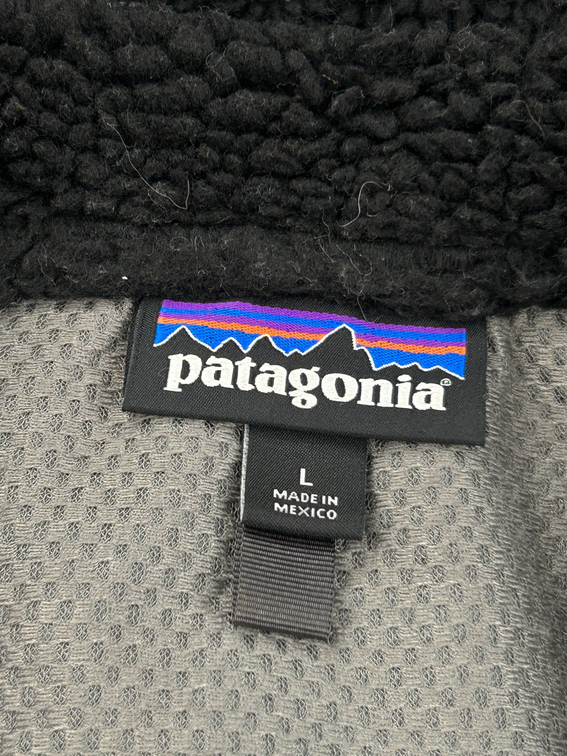 This is a Patagonia Classic Retro-X Vest in black fleece with a full-length front zip, stand-up collar, a zippered chest pocket, and two zippered handwarmer pockets.
