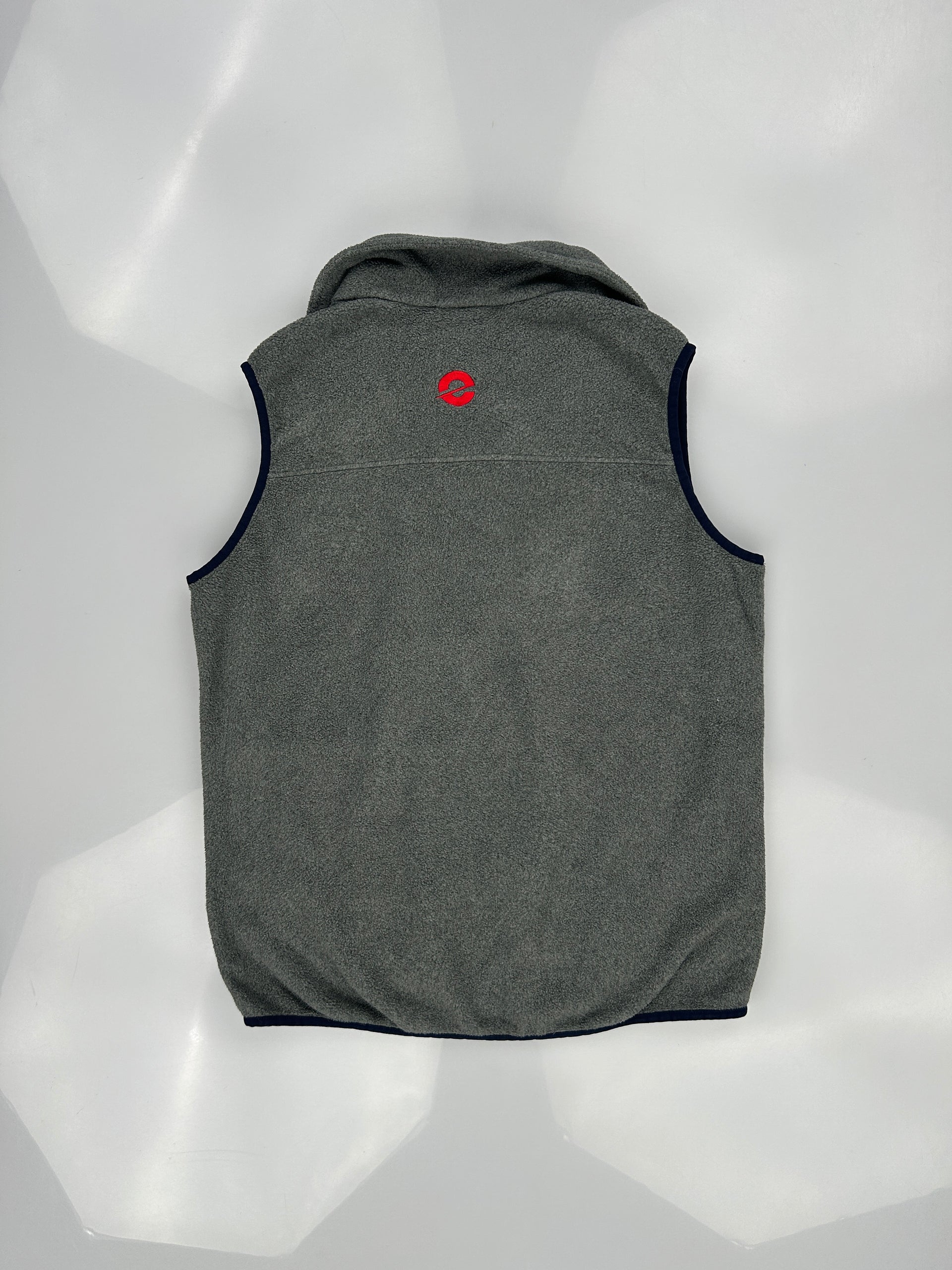 This is a Patagonia Synchilla Fleece Vest in gray with blue trim.