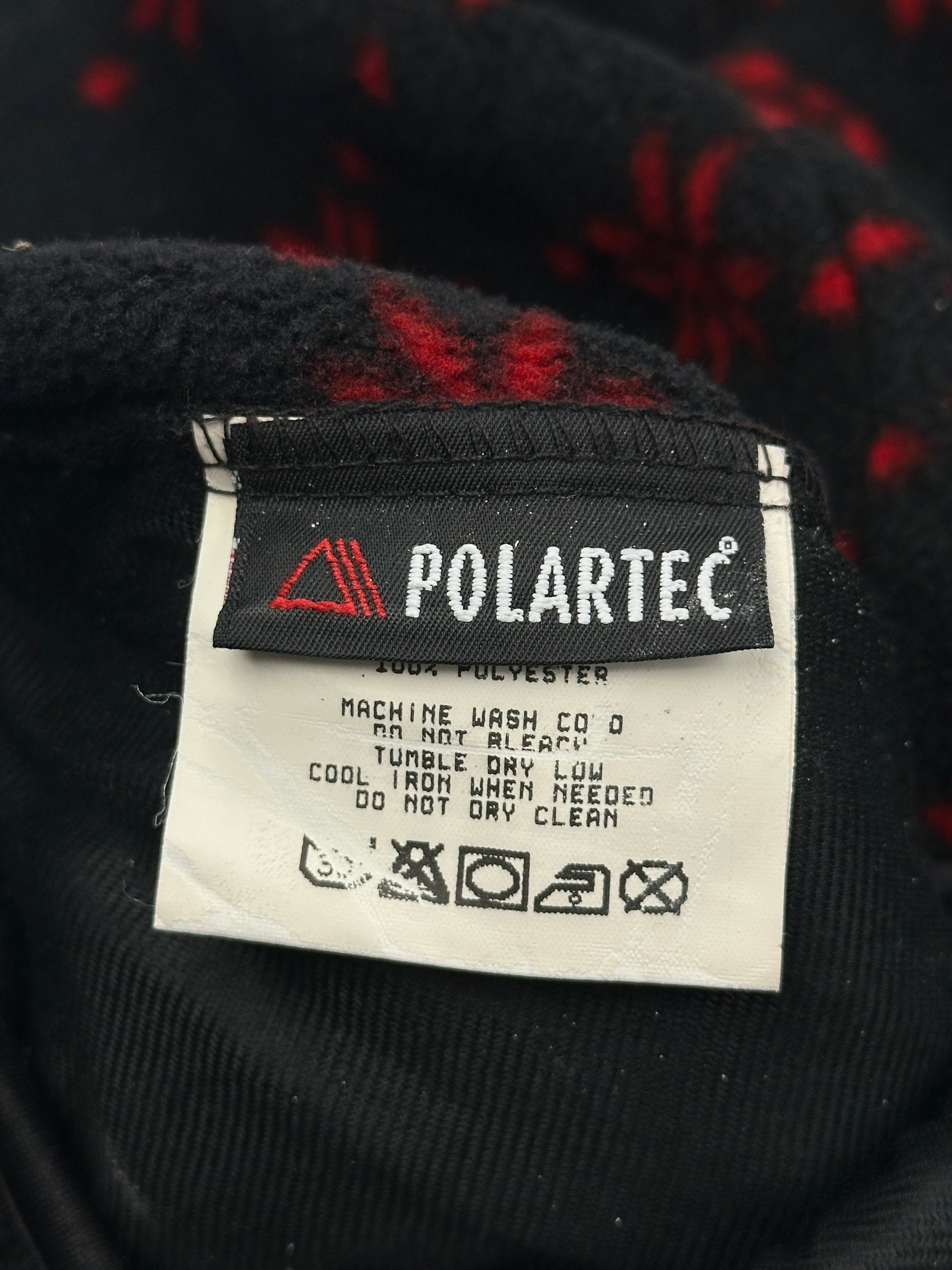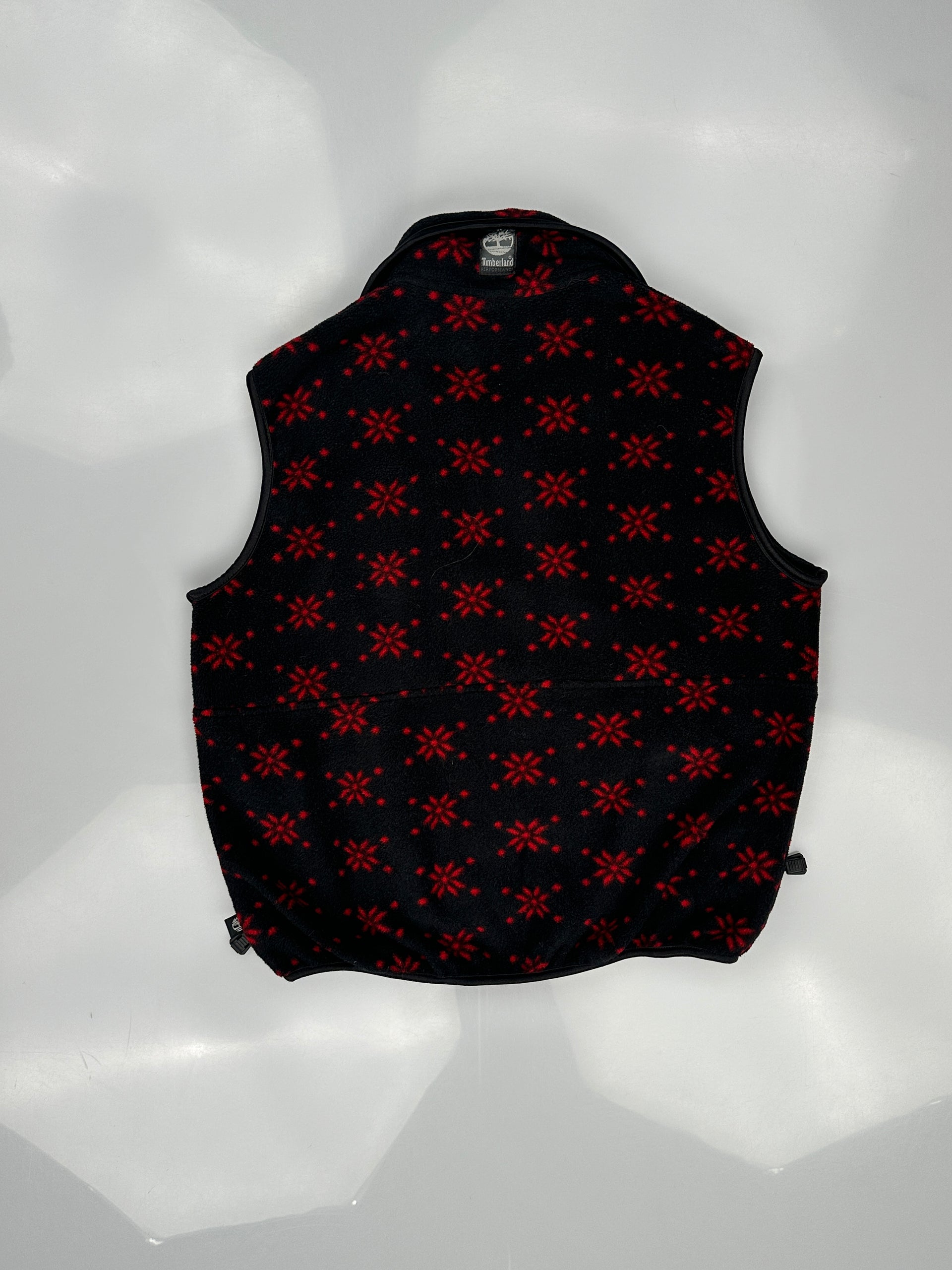 This is a vintage Timberland fleece full-zip vest with a black and red snowflake pattern.