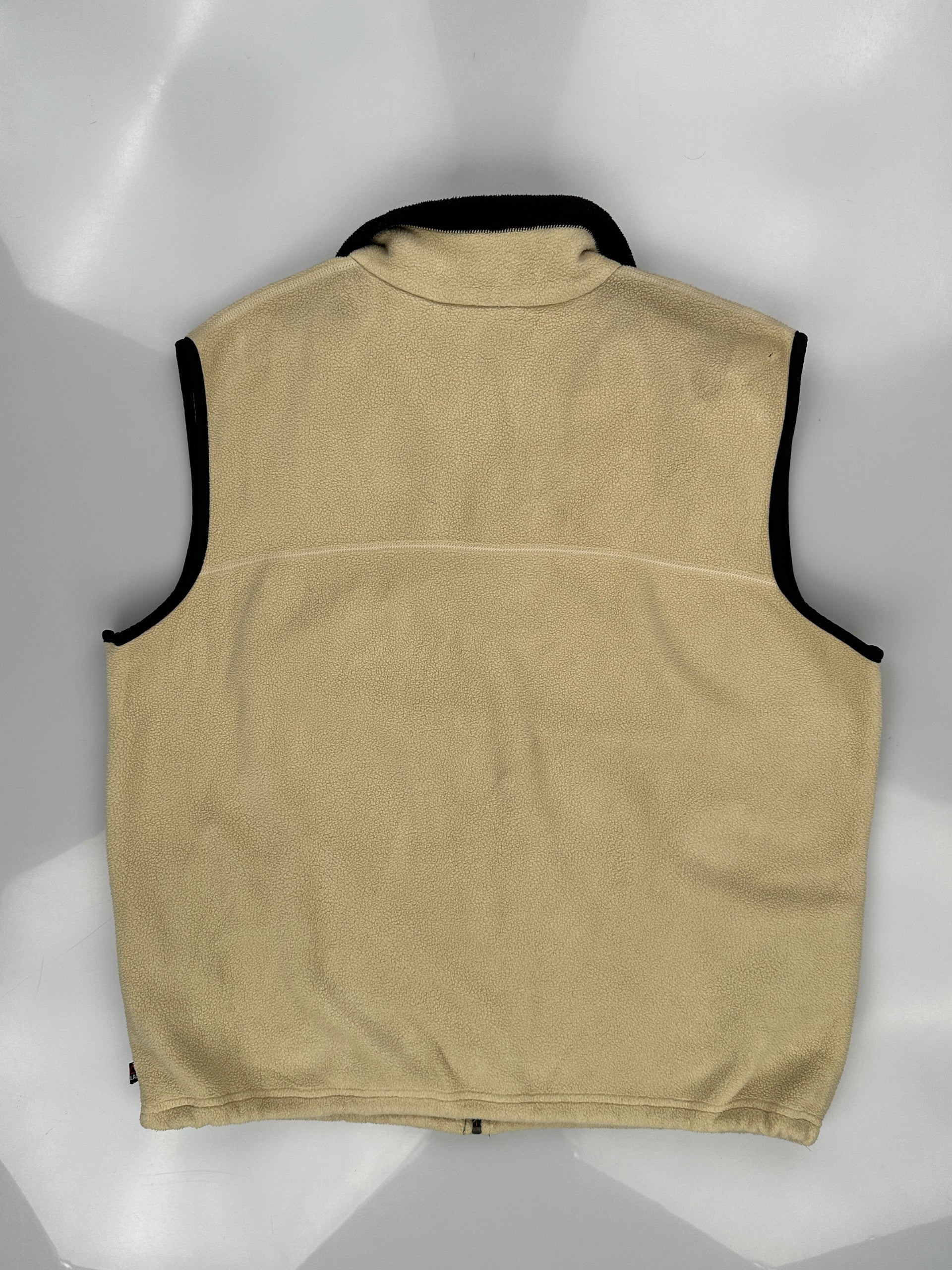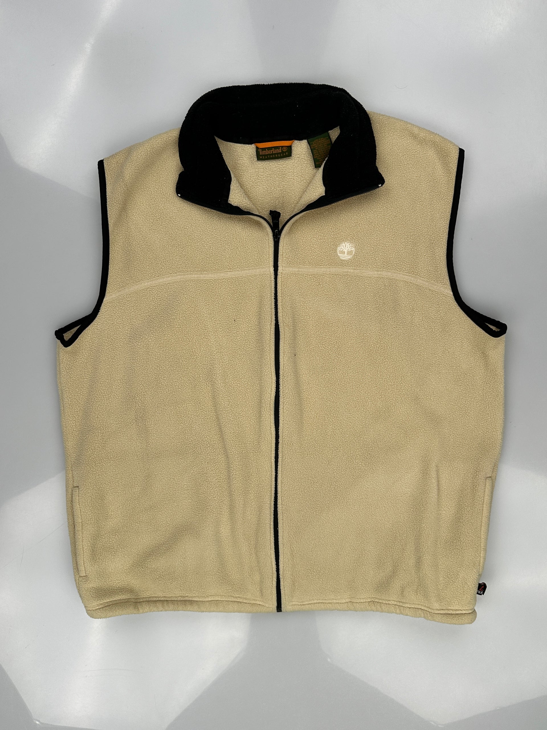 This is a beige Timberland fleece half-zip top.