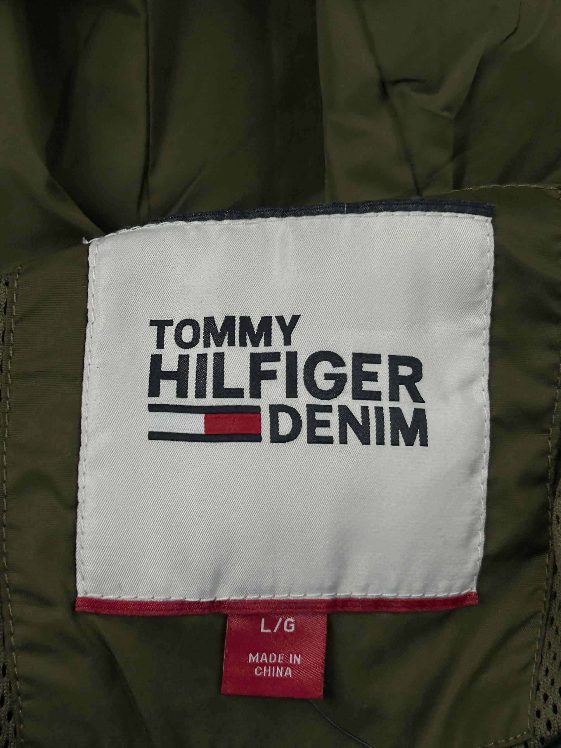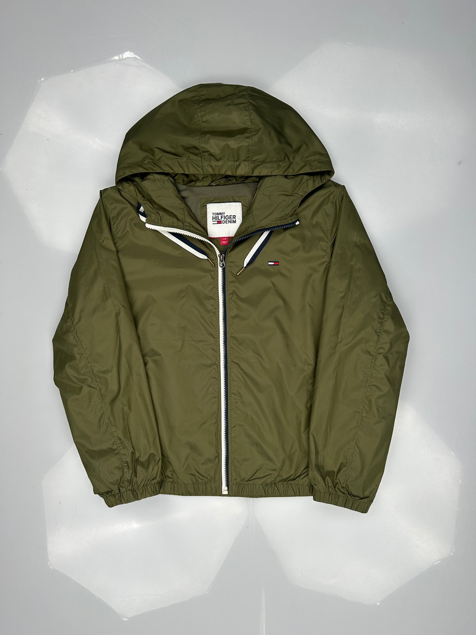 This is a Tommy Hilfiger hooded windbreaker jacket in olive green