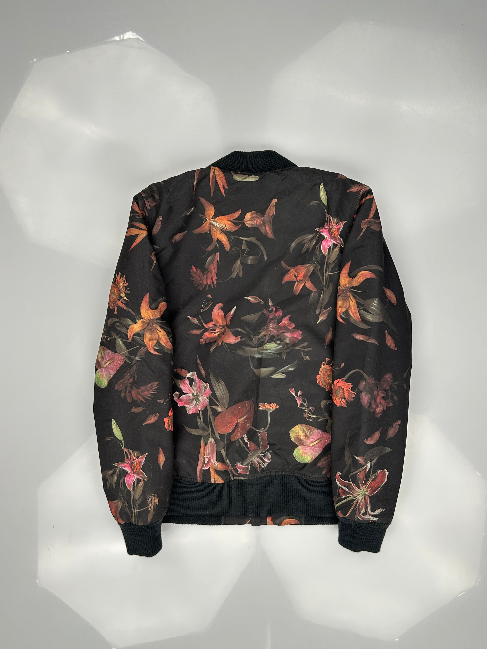This is a Vans black multi-color floral print bomber jacket.